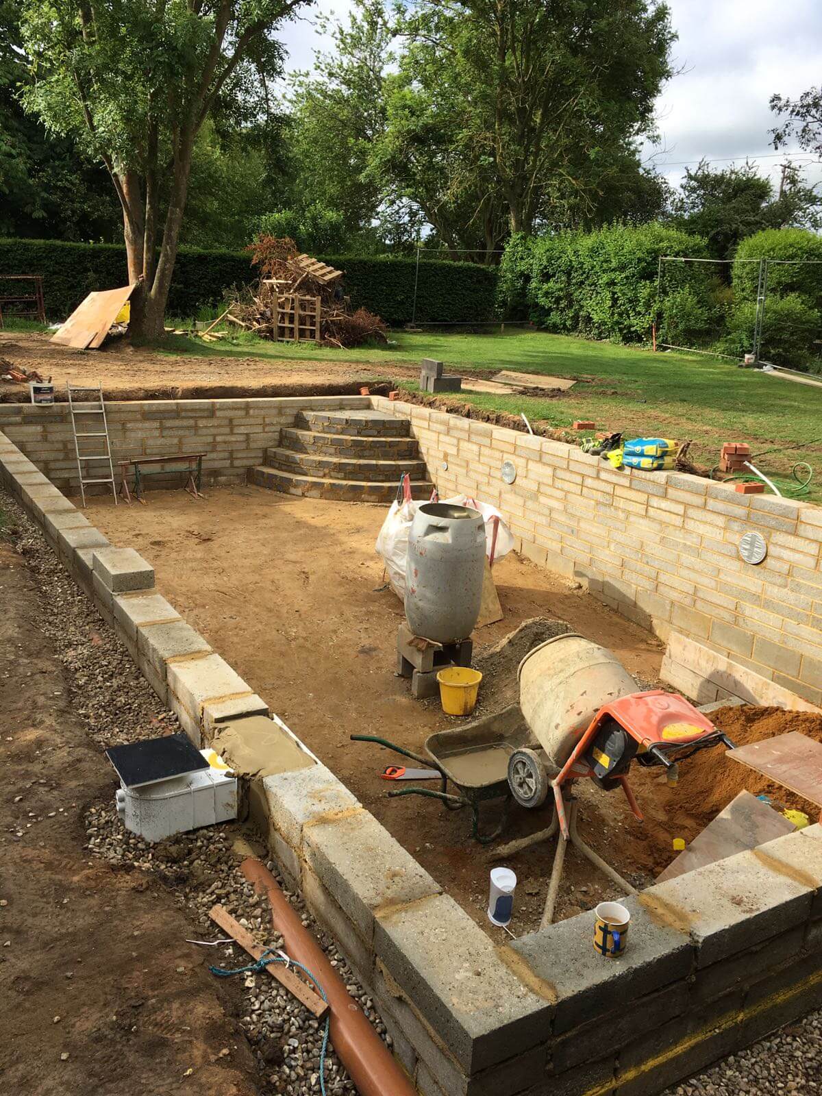 The liner pools constructed by PA Hollingworth & Co are formed concrete blockwork built off traditional foundations at the bottom of the excavation which provides a more permanent structure than the panel pools often seen. These walls form the structure shape, which can be traditional like a rectangle, or, in a limited free-form shape, also worthy of mention is that when finished they look exactly the same as the more expensive solid concrete pools in terms of pool coping and surround whereas the panel pools are limited to the edge coping detail and steps.