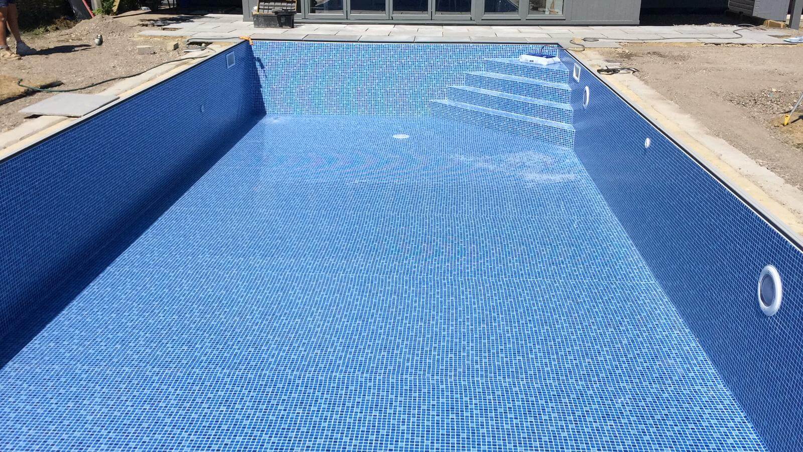 The structure of these pools is not waterproof hence a liner must be used and whilst tiling these pools is not an option there is a wide range of quality liners available printed in various shades and styles. These liners can be either those made off-site which is vacuumed into place or a tailored liner fitted on site which can be used for free-form steps and provide an even better, more upmarket finish.
